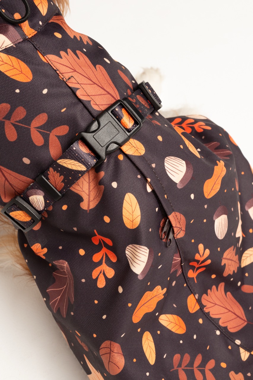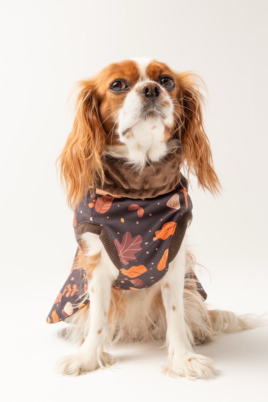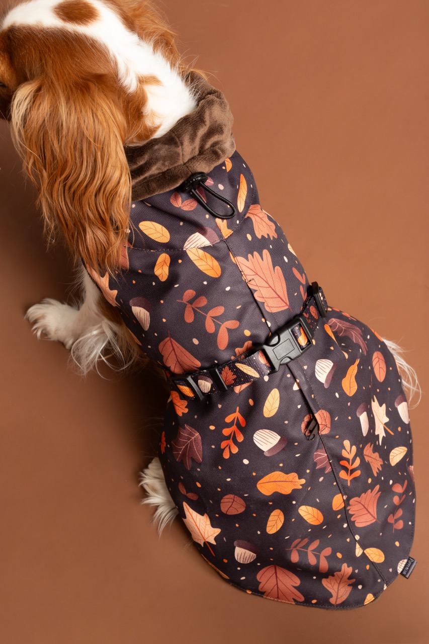 Projekt nadruku stworzony został specjalnie dla Puppymour – motyw jesiennych liści, szyszek i ciepłych barw sprawia, że Twój pies będzie wyglądał wyjątkowo.