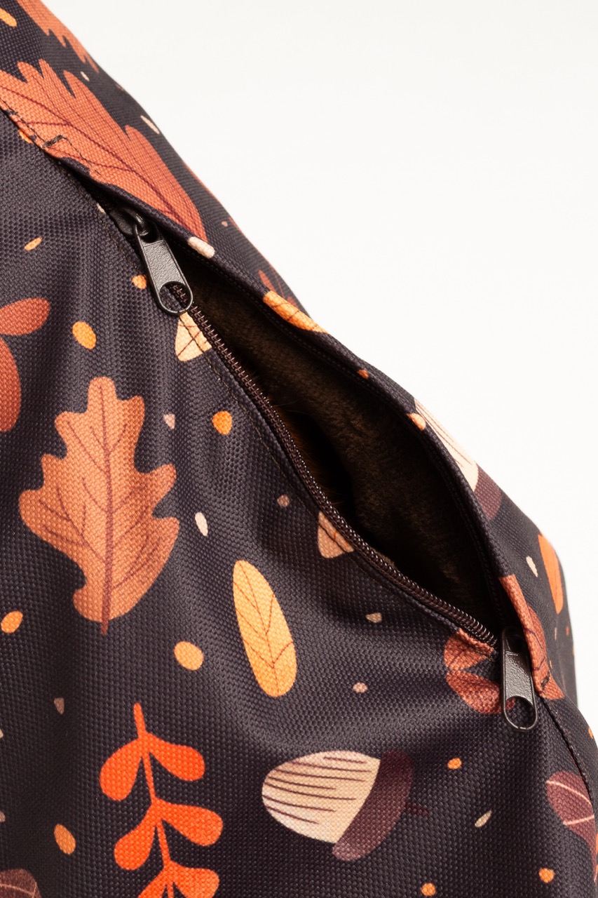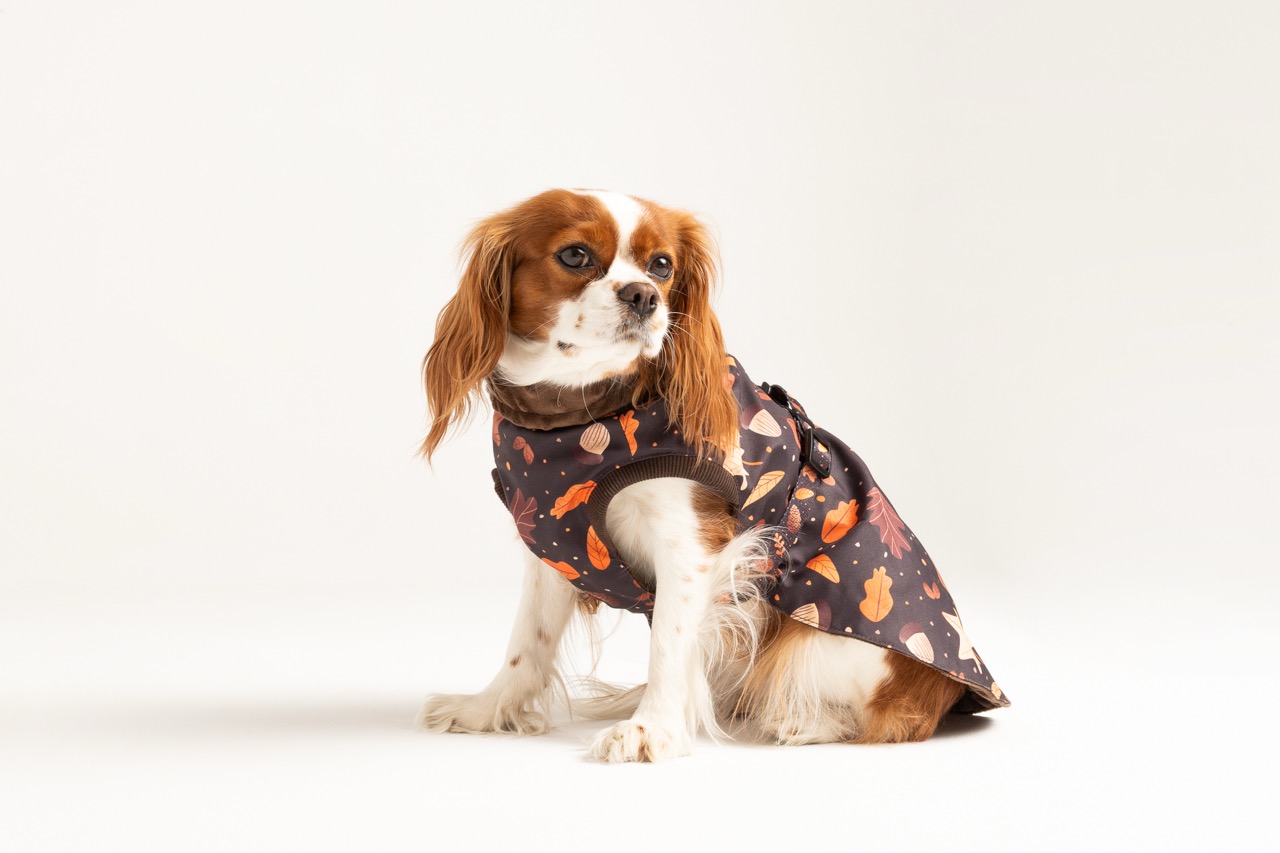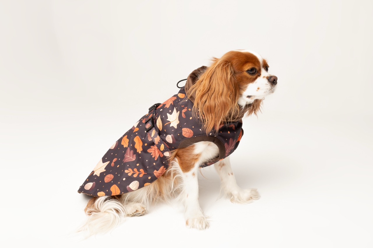 Projekt nadruku stworzony został specjalnie dla Puppymour – motyw jesiennych liści, szyszek i ciepłych barw sprawia, że Twój pies będzie wyglądał wyjątkowo.