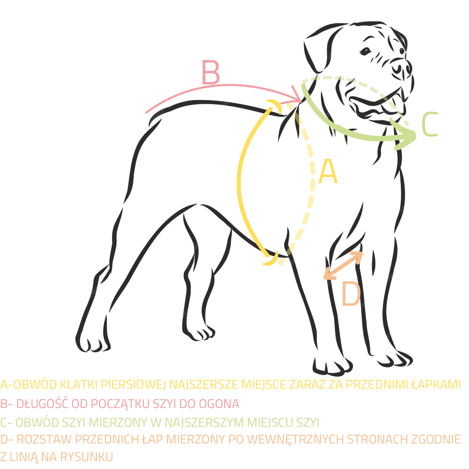 ⚠️ UWAGA: Produkt jest szyty od podstaw specjalnie dla klienta i nie podlega zwrotowi. Jeśli masz problemy z dokładnym zmierzeniem swojego psa, skontaktuj się z nami – z przyjemnością pomożemy!