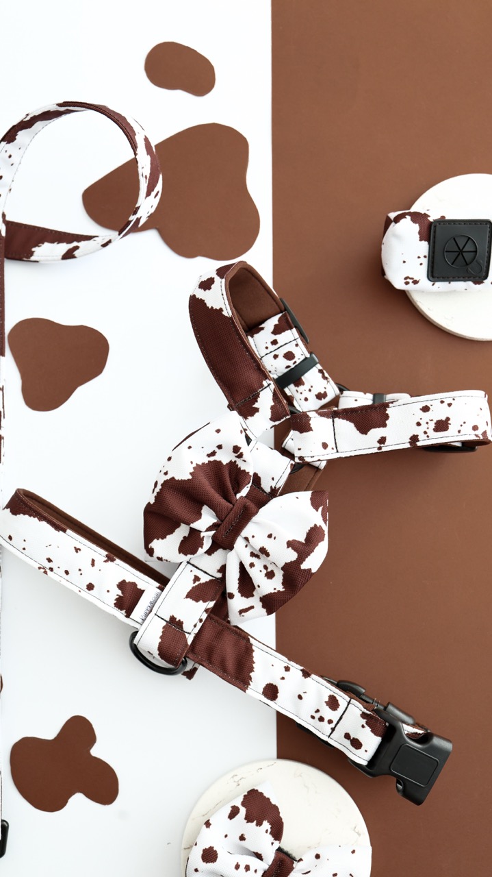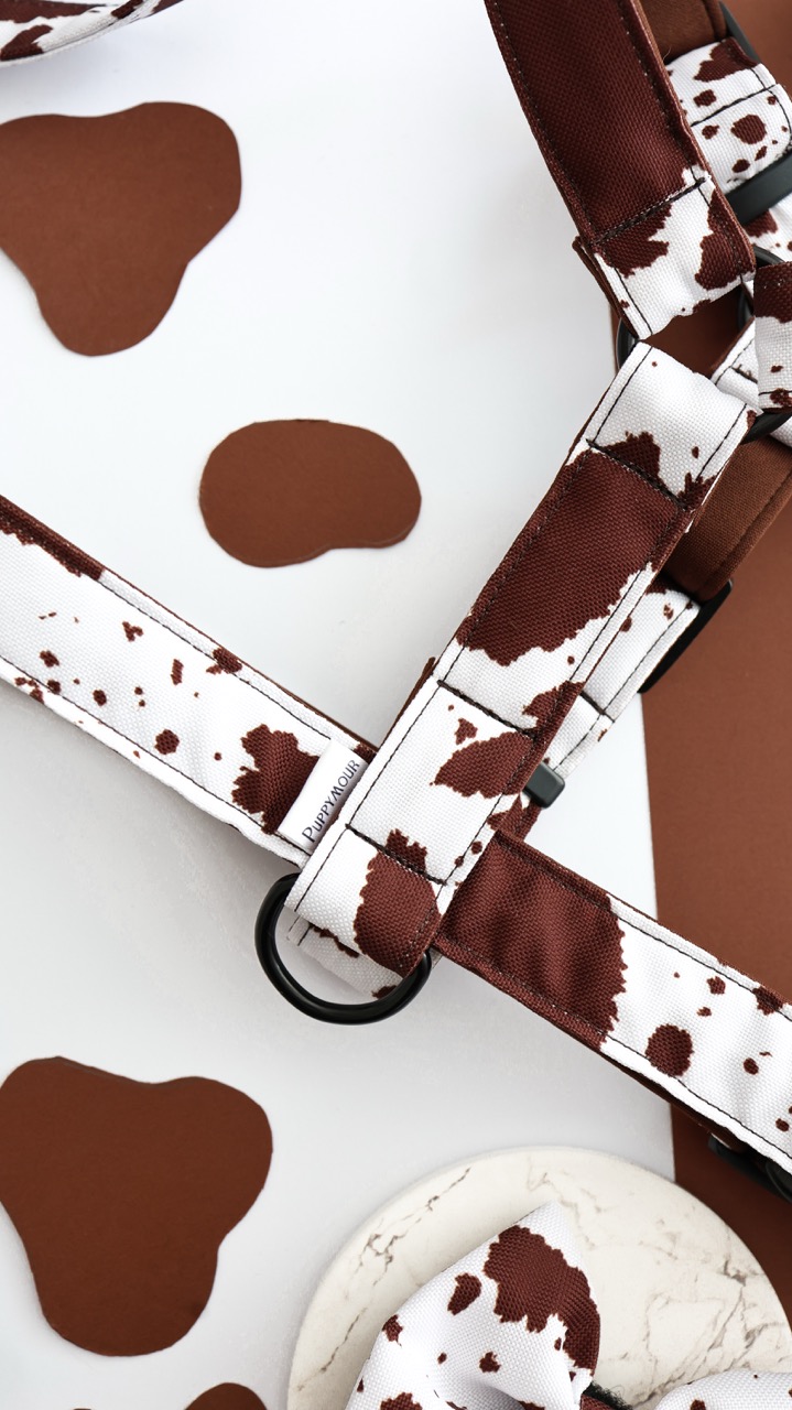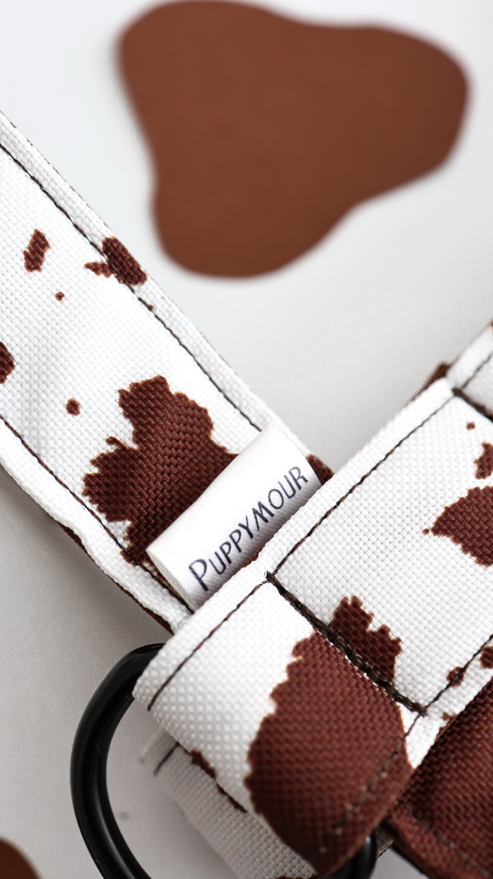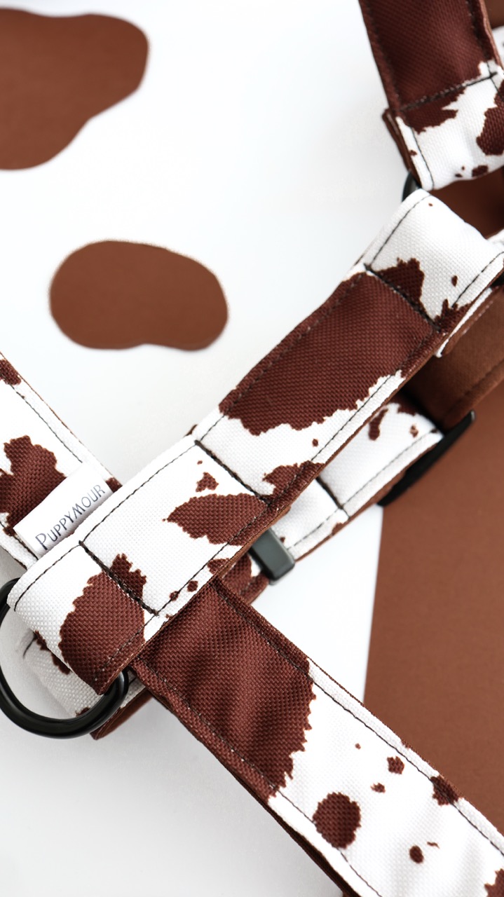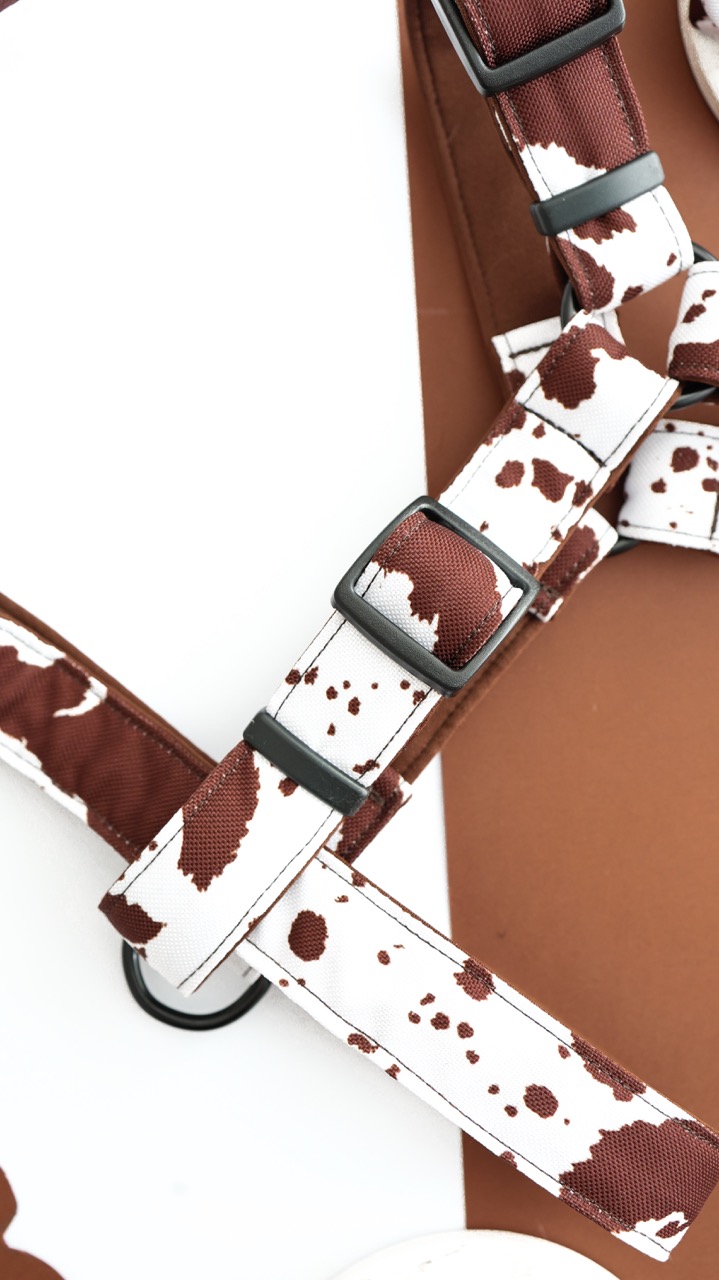 Brązowo-biały krowi print nadaje niepowtarzalnego charakteru. To szelki, które przyciągają spojrzenia w parku, w mieście i na wyjazdach.